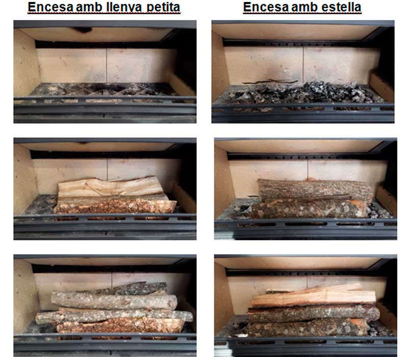 - Col·loqui els troncs més gruixudes a la base sempre deixant espais entre ells. Aquests espais afavorirant la circulació de l'aire per l'encesa del foc i evitaran acumulacions de fums. Si s'utilitza fusta trossejada o oberta millora l'encesa ja que l'escorça exterior dels troncs redueix la sortida dels gassos inflamables de la fusta.