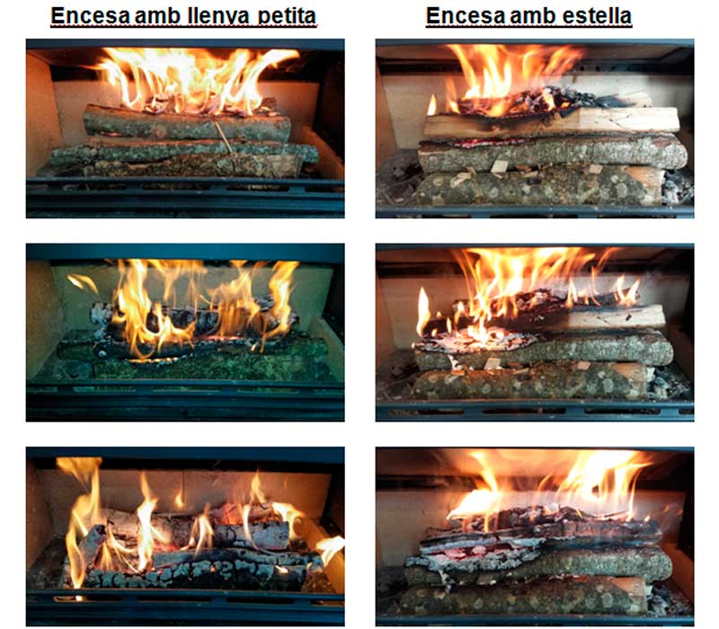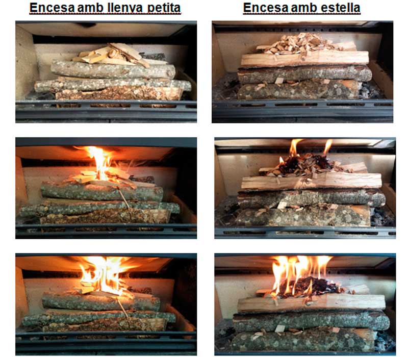 - Mantingui les entrades d'aire obertes per facilitar l'entrada d'oxigen i milorar l'ignició dels gassos inflamables de la fusta. En funció del tipus d'estufa s'aconsella deixar la porta d'aquesta entre oberta. Recordi de tancar la porta una vegada estigui encés el foc!!