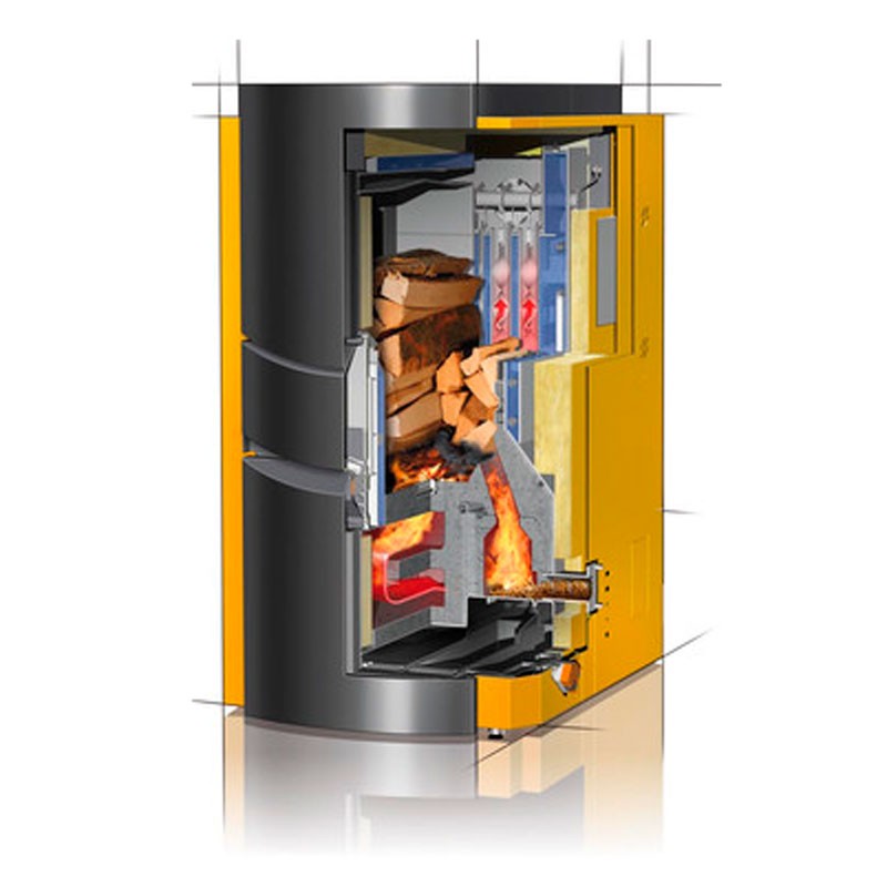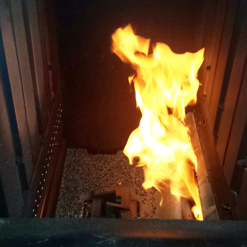 - EFICÀCIA: Fases molt curtes d'emissió de fums. El disseny de la càmara de combustió fa que la flama del pellet encén la llenya en diagonal des de a baix per continuar amb la gasificació de la llenya.
