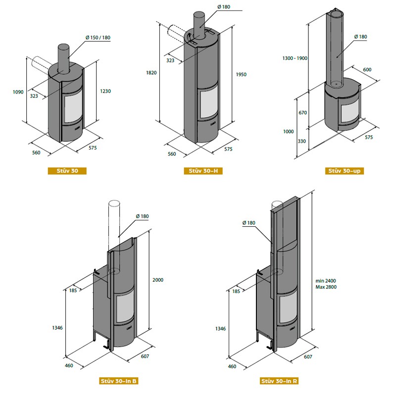Dins de les Stûv 30 hi ha disponibles altres models com; suspensió (UP), insertable (IN) o amb acumulador de calor de 150 Kg (H), amb diferents acabats i opcionalment kit de barbacoa.