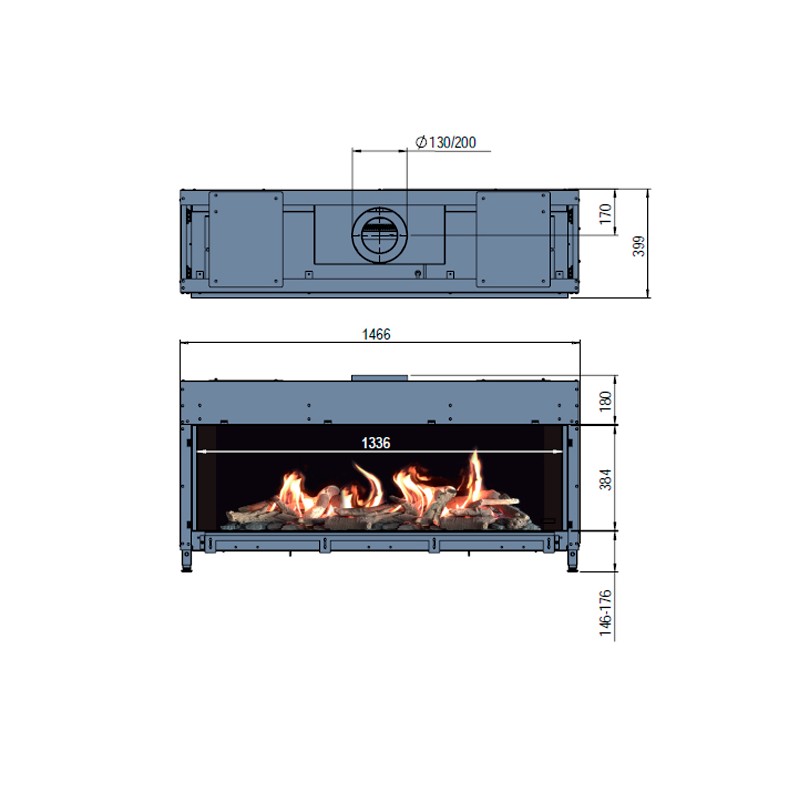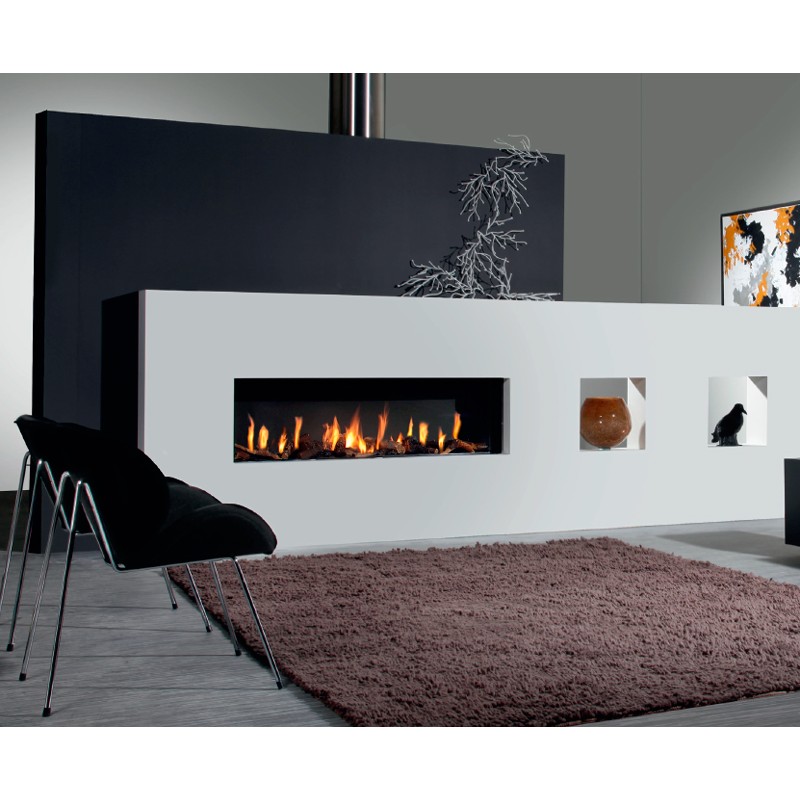Llar de foc de gas horitzontal frontal, model Relaxed Premium XL de la marca FABER. Disposa d'un encès remot i cremador Step Burner, que ajusta la potencia de la flama en 4 posicions d'intensitat, a més, hi han opcions de decoració amb efecte de llenya o pedres.