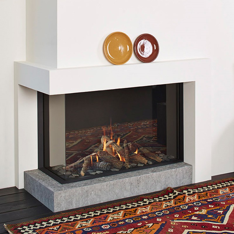 Llar de foc de gas de racó, model B-100 H de la marca Stûv. Té doble difusor de injectors de gas amb cremador efecte llenya, calor ajustable, mode "eco wave" per modelar la flama y reduïr un 45% el consum. Acabat estàndar o xemeneia Under-Cover amb pedra blava.