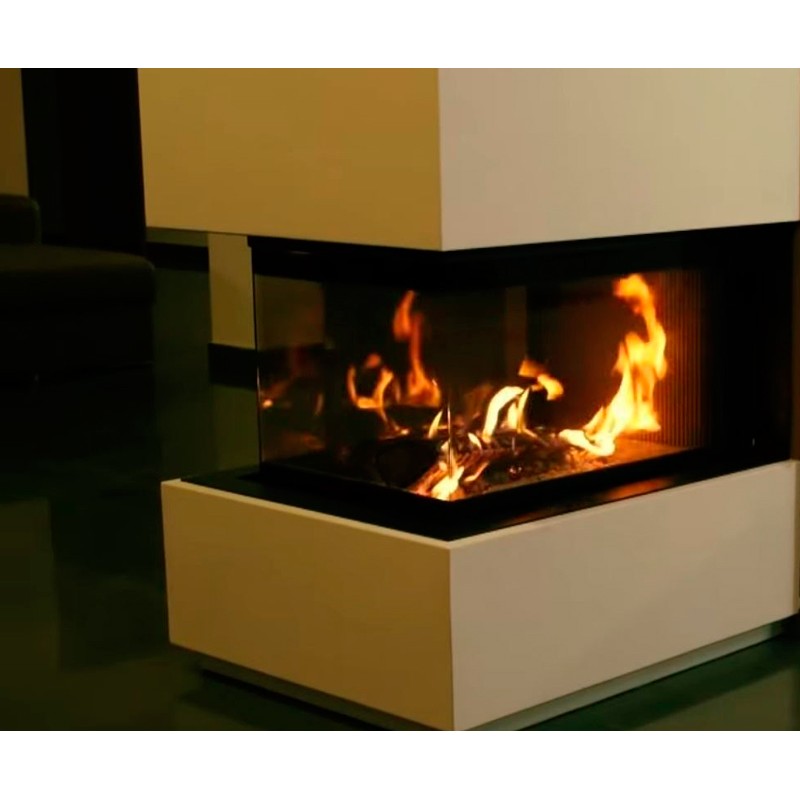 Llar de foc de llenya amb porta de guillotina de 3 costats en península , model Luna 900CR Diamond de la marca M-DESIGN. El disseny, l’elegància i la innovació de M-DESIGN és garantia de confort i bellesa de la flama així com d’un elevat rendiment.
