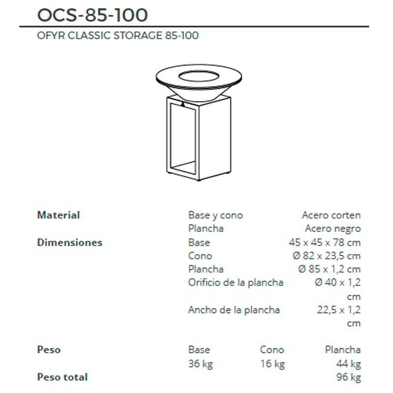 Barbacoa de llenya de la marca OFYR model Classic Storage, esta fabricat en acer corten especialment tractat que la fà resistent a la corrosió i al pas del temps en exteriors. Disposa de calaix per emmagatzemar llenya.