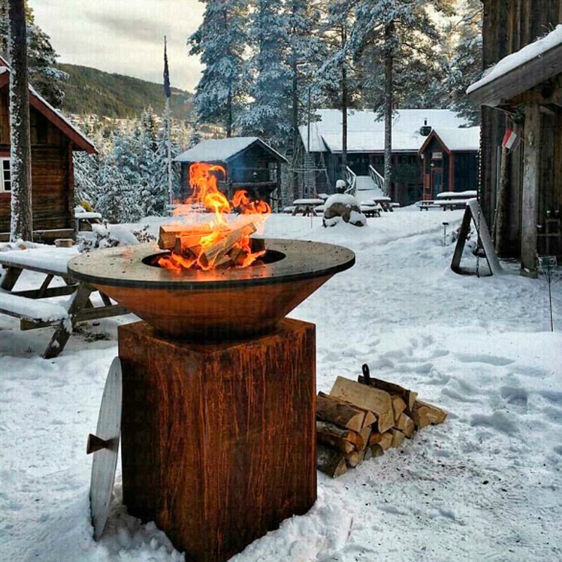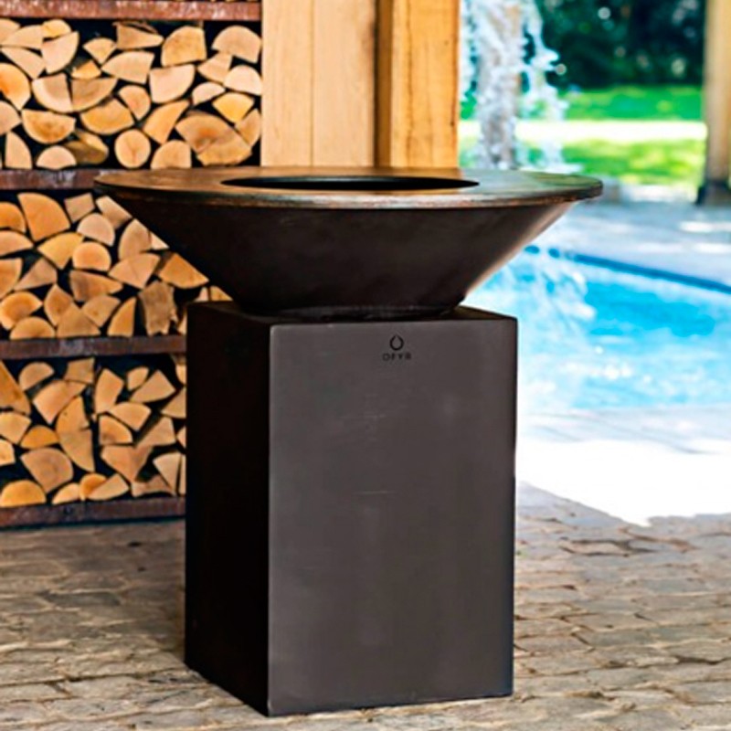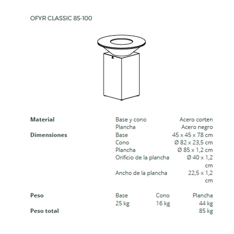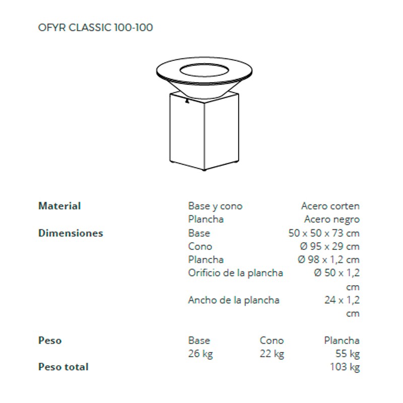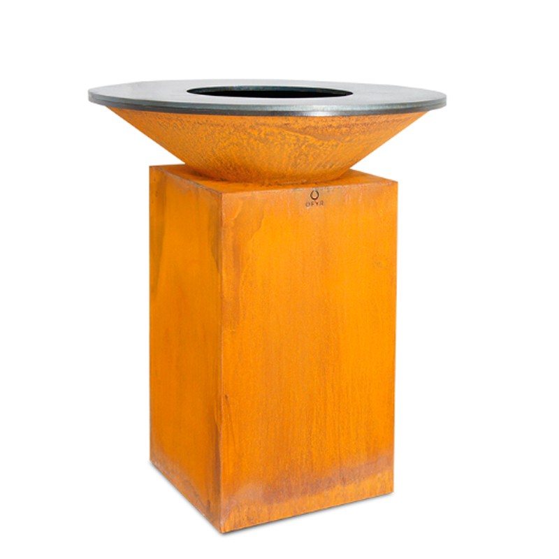 Barbacoa de llenya de la marca OFYR model Classic, està fabricat en acer corten especialment tractat que la fà resistent a la corrosió i al pas del temps en exteriors. Disposa de calaix per emmagatzemar llenya.