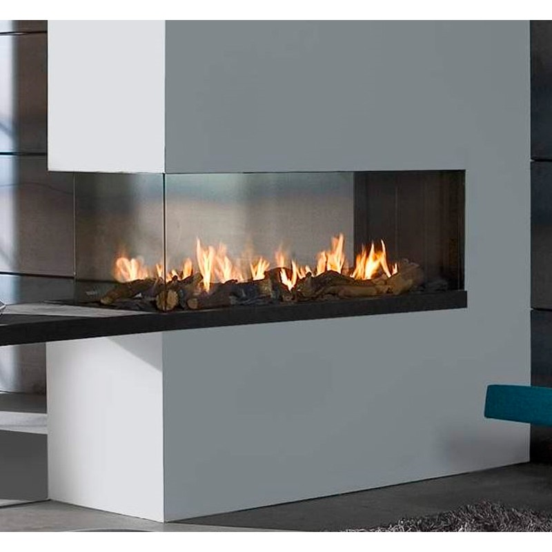 Chimenea de gas de 3 caras en península, modelo Aspect Premium RD XL de la marca FABER. Dispone de encendido remoto, quemador Step Burner, que ajusta la potencia de la llama en 4 posiciones de intensidad, además cuenta con opciones de decoración con efecto de leña o piedras.