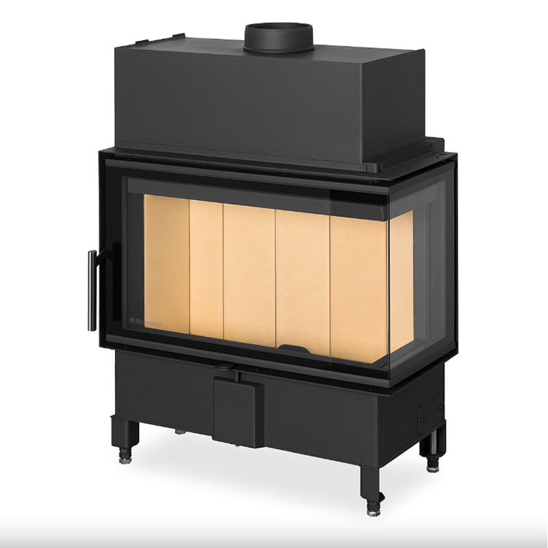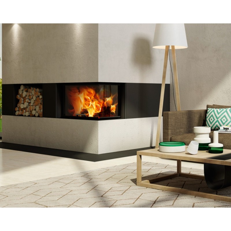 Con cajón cenicero y cámara de combustión en chamota. Cristal serigrafiado "double spin" resistente y de fácil limpieza.