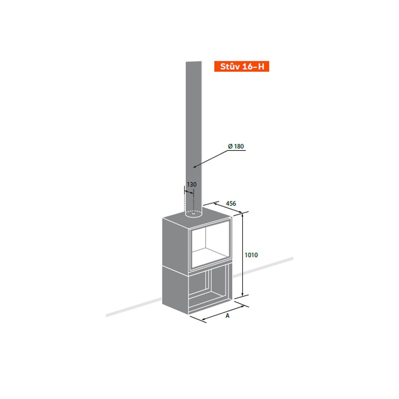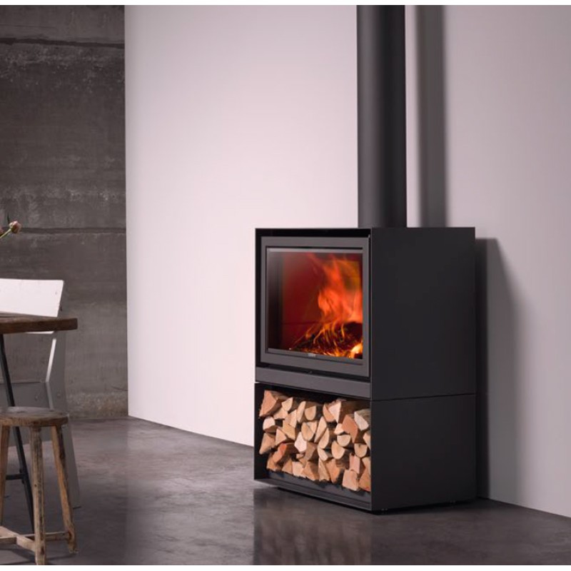 Chimenea de leña con puerta frontal de la marca Stûv. La familia Stûv 16 modelo H, con reserva de troncos integrada, une el diseño con la tecnología más avanzada, ofreciendo un sistema de doble combustión para un rendimiento óptimo, y poder disfrutar de la perfección de las llamas.