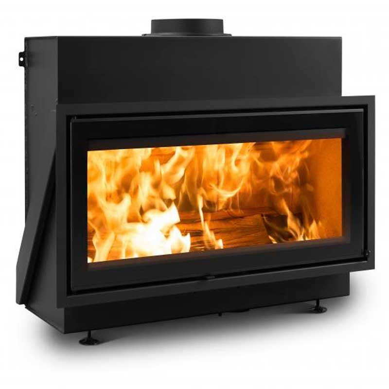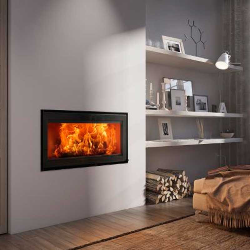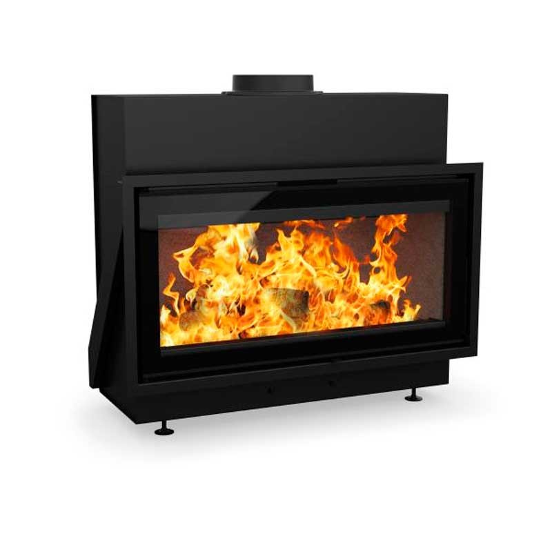 Hogar de leña amb una vista panorámica del fuego de la marca Dovre. La tecnología de Dovre es garantía de una combustión ecológica así como de un elevado rendimiento. Hogar de leña equipado con el Sistema de Airwash que mantiene el cristal limpio.
