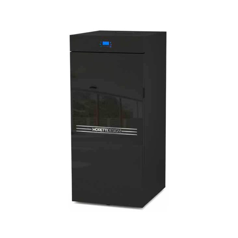 Caldera de pellet TECNIKA TURBO GLASS de la marca MORETTI. Es una caldera hidro y por lo tanto produce agua caliente dando la posibilidad de conectarla a todo el sistema ya existente.
