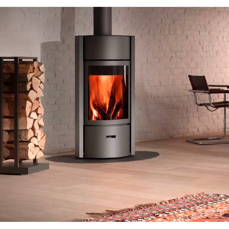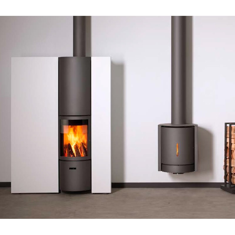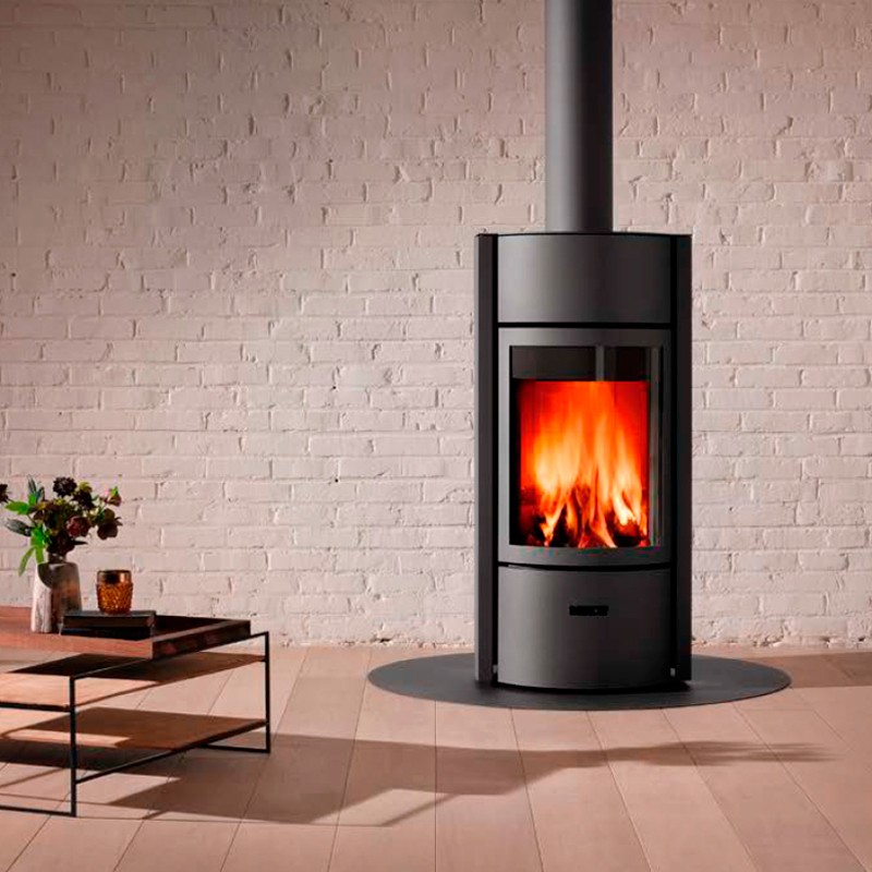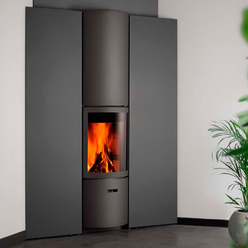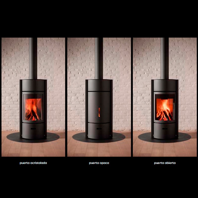 Estufa de leña de la marca Stûv. La familia Stûv 30 ofrece un modo de uso único con el sistema de 3 puertas. Girando el tambor hasta la posición deseada podemos tener fuego abierto, puerta de cristal o puerta opaca.