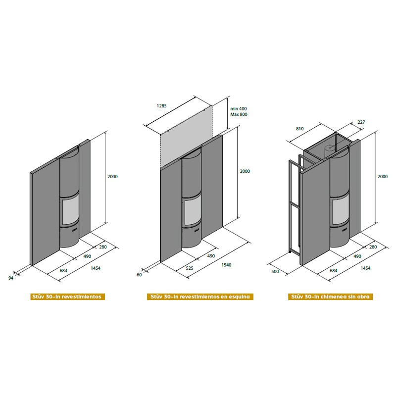 Dentro de las Stûv 30 hay disponibles otros modelos como; suspendido (UP), insertable (IN) o con acumulador de calor de 150 Kg (H), con varios acabados y opcionalmene kit barbacoa.